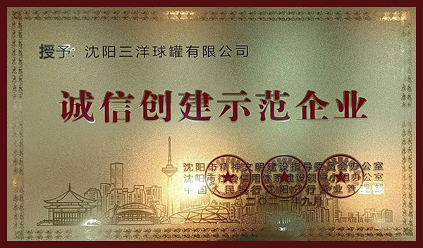 2021年11月26日沈陽三洋球罐有限公司被確定為“沈陽市2021年誠信創建示范企業”。